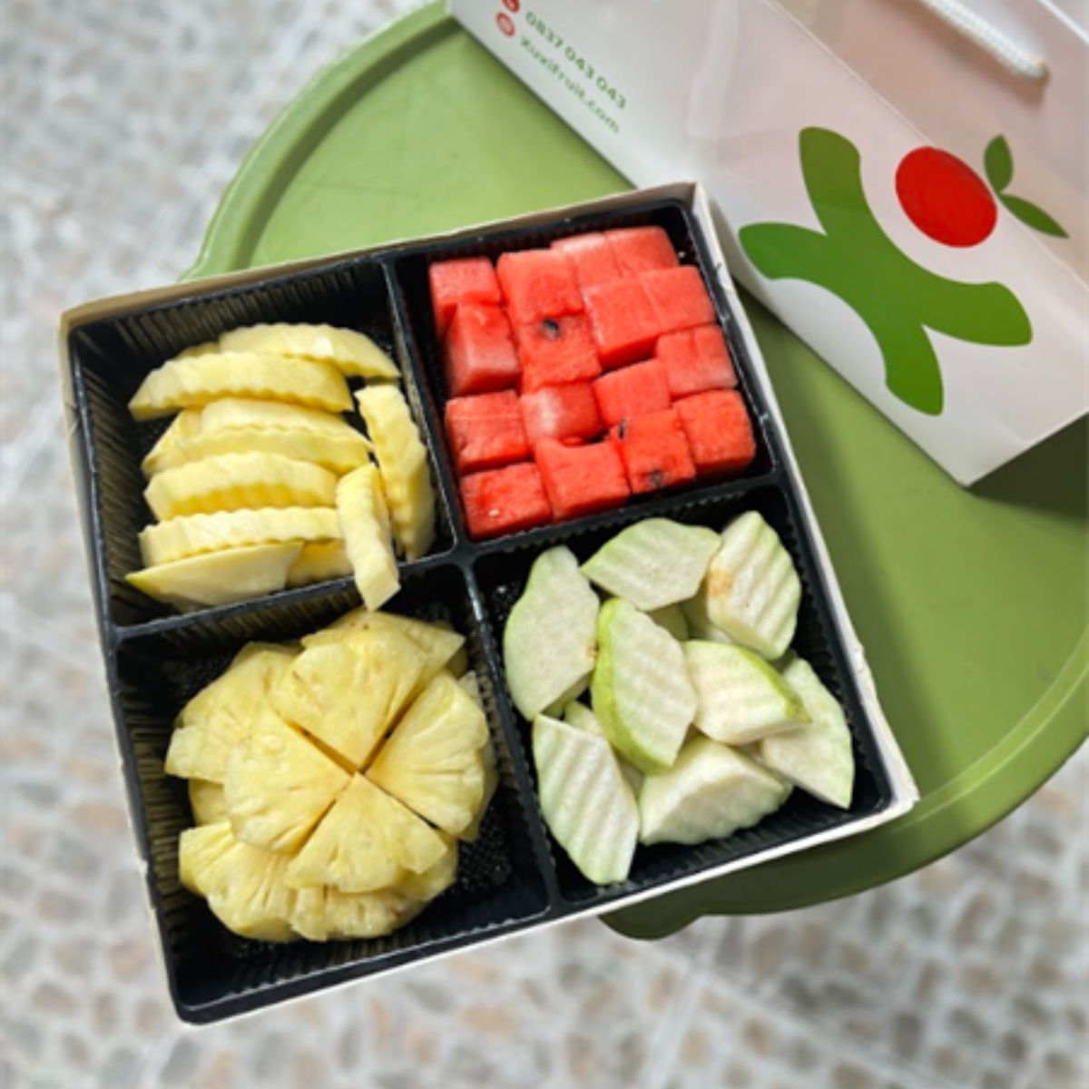 Đóng gói: Trái cây cắt sẵn đóng ở box giấy 4 ngăn an toàn thực phẩm, có nắp đậy, thắt nơ sang trọng kèm túi giấy đựng.